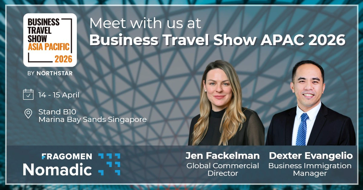 Nomadic is exhibiting! Heading to Singapore? We'd love to connect. Complete the form below to book time to meet with Global Commercial Director, Jen Fackelman, and Immigration Manager, Dexter Evangelio at Stand B10 to learn how Nomadic can support your team with corporate cross-border travel compliance and business visa solutions.